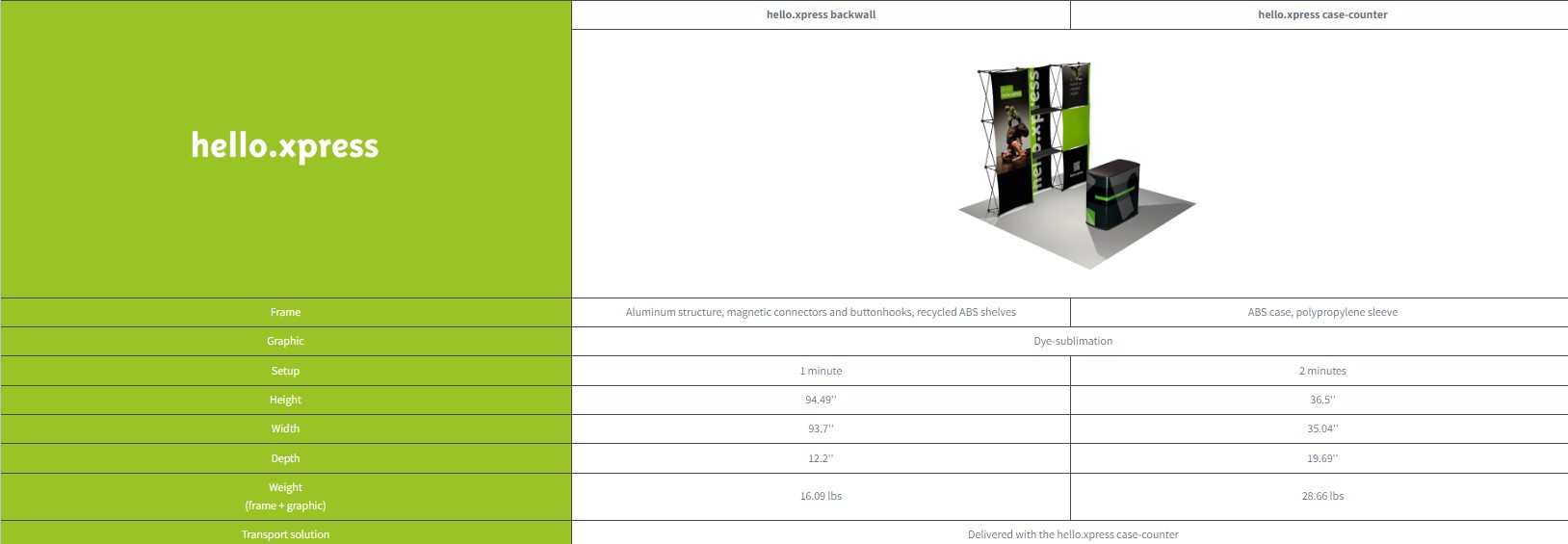 Portable solution: 43 lbs for hello.xpress (frame + graphic + counter-case) transportable in a wheeled case, which transforms into a reception counter equipped with a storage area.